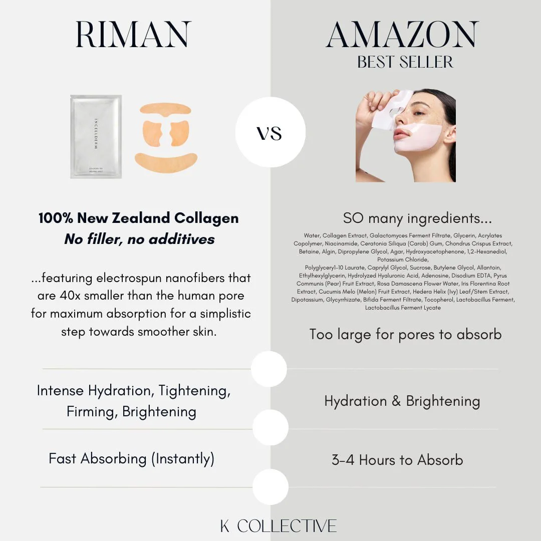 These are 100% pure collagen- no additives or fillers. This is one of my favorite skincare products! Riman Collagen sheet masks are known for their high quality ingredients. They are designed to help hydration, improve skin elasticity, reduce the appearance of fine lines and wrinkles and helps promote a smoother more radiant complexion. You can use them daily or weekly for more glow to the skin.