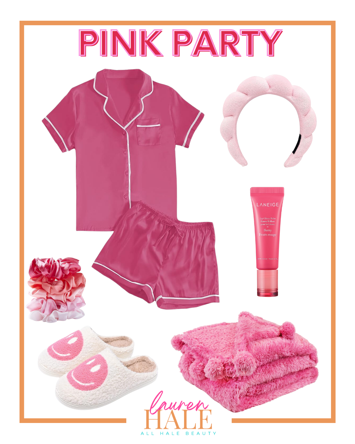 If you love pink, like I do, this collage is perfect for you! These Amazon pajamas are very comfortable and a great price. I added some fun accessories that will elevate any sleepover! The Laneige Lip Mask leaves my lips feeling amazing! Pair the Laneige Lip mask with comfy slippers and a blanket for a great party favorite!
