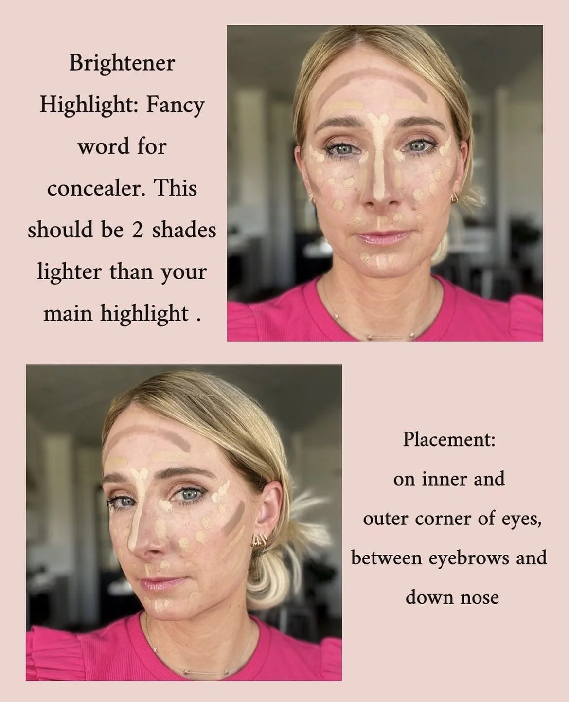 Brightener Highlight: This color should be 1-2 shades lighter than your skin tone. Apply on the inner and outer corners of the eyes, center of the face and anywhere you need brightness